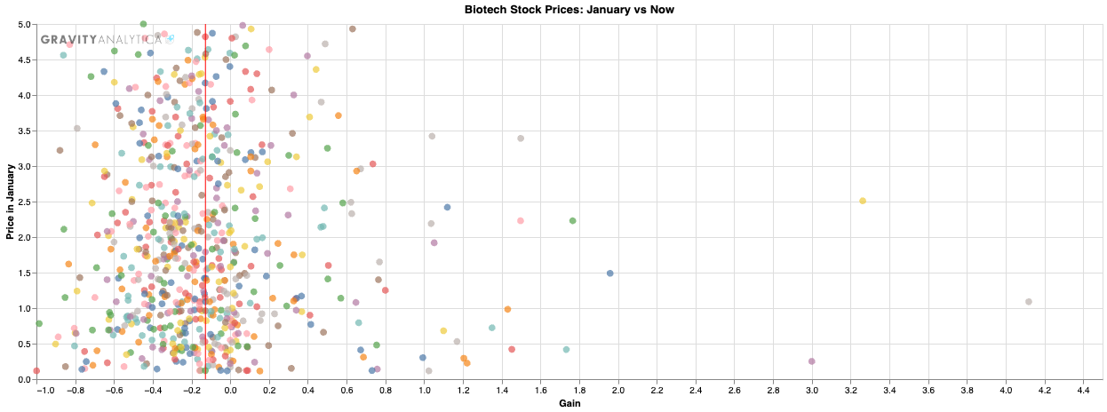 Of those 1249, 880 (70%) are down on the year. I think we all know what those stocks are. This analysis is to today’s closing price only. The mean return for these stocks is -12%. The mean return for the “penny stock” subset is -13%.