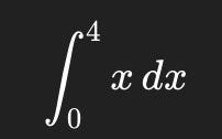 Written in another way: Laske käyrän y = x alapuolinen pinta-ala välillä x = 0–4.