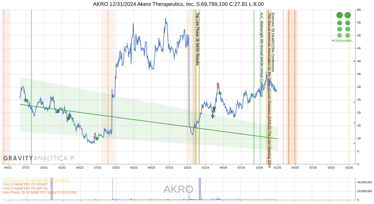 4th Place is NASDAQ:$AKRO which we have played twice on the last few years. A very high risk trade to have held through the orange event but it seems to have worked out well. We sold before the events on both round trips. Pretty easy to see where we bought and were we sold.
