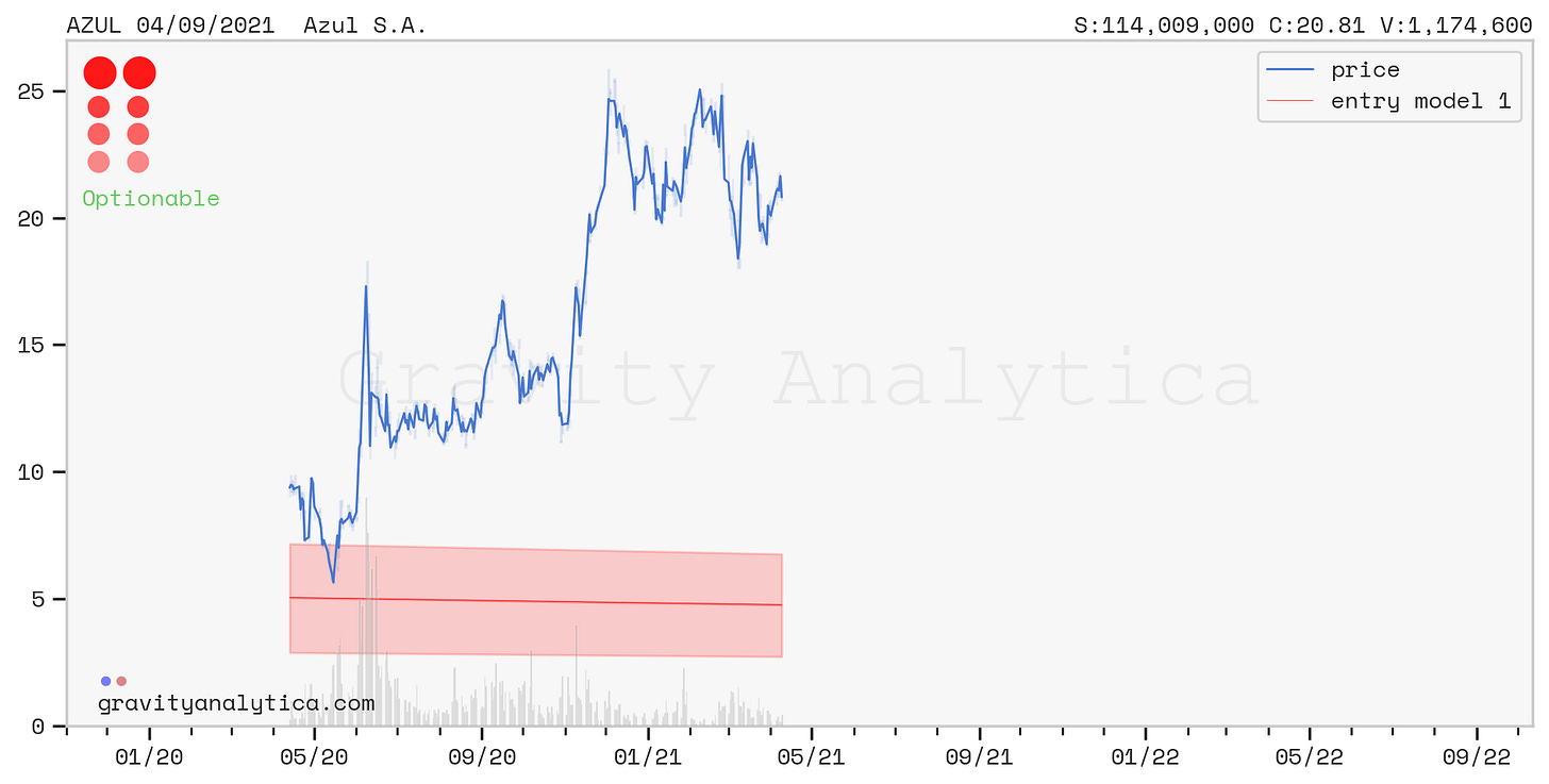 An example stock that did do the swan dive is Azul S.A which is the largest airline in Brazil. And yes, the stewardess are very attractive.