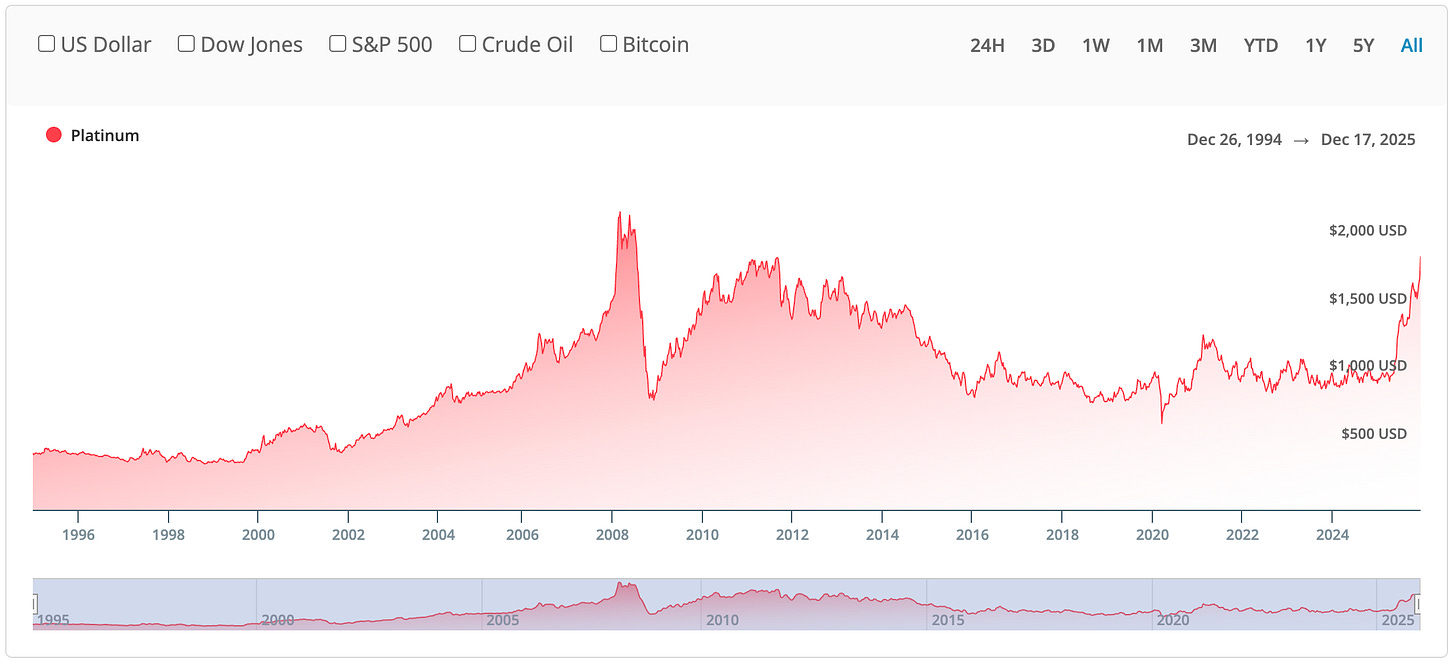 Here are the historical charts of silver and platinum. It would be rather ironic if these two metals switched rolls this time around.