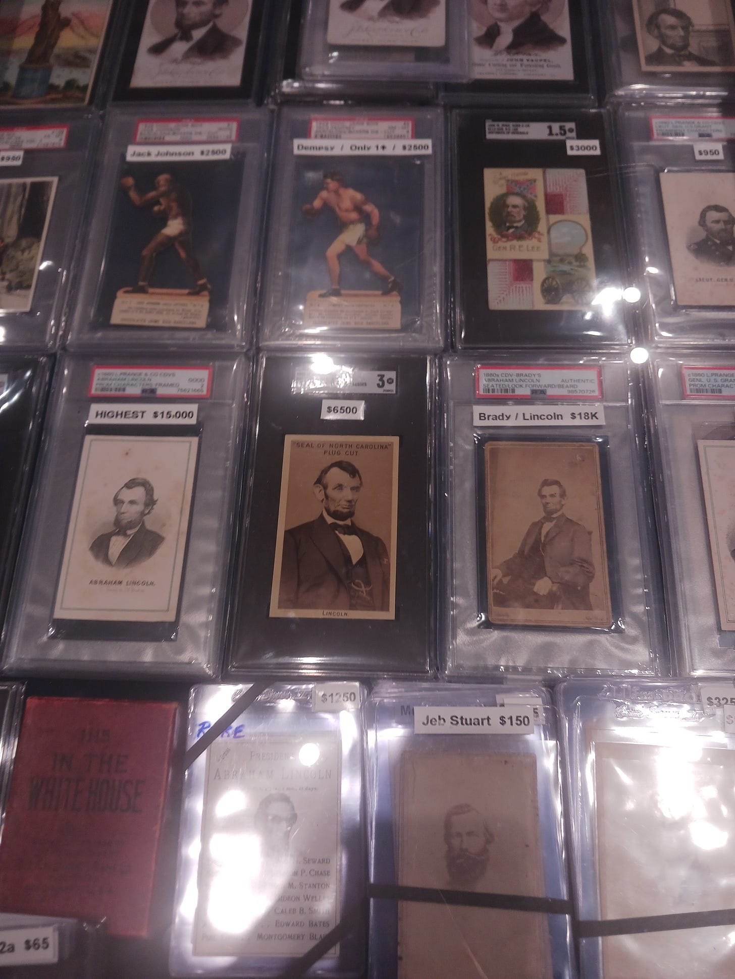 Below are three Abe Lincoln “cards.” The one on the right listed for $18k ($25k on Ebay) and is reported by PSA as population 1. But, I personally know this carte de visite (CDV, i.e. photograph) is not rare. I found one a few years ago at an estate sale for $1 here in Atlanta.