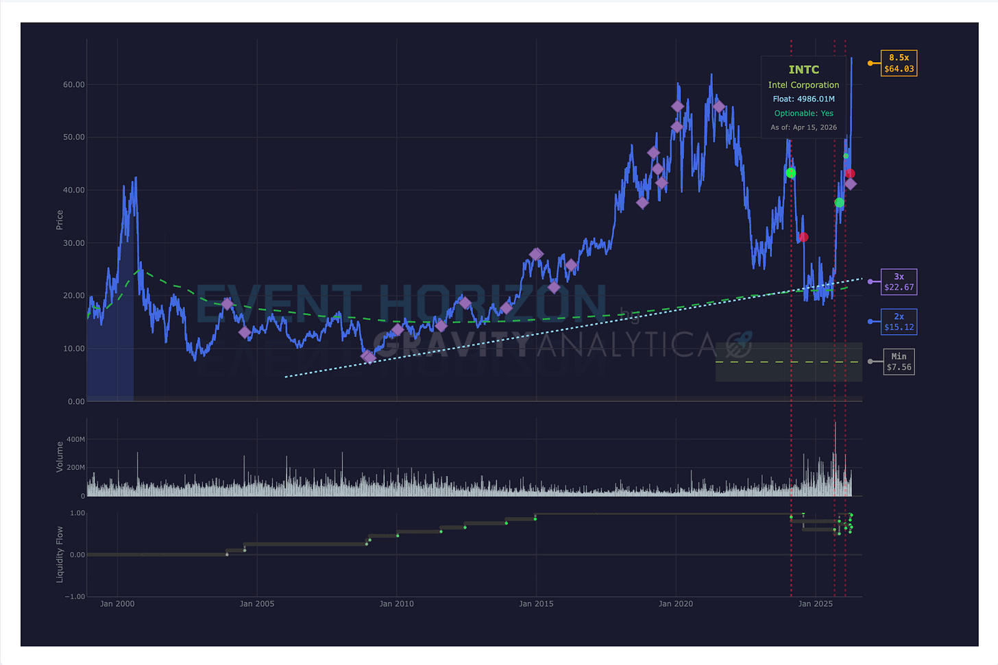 Intel shot up. I am drawing attention to this because the stock’s gain since 2020 is the same as the gain since January 2026. Who says timing isn’t important? And to just remind people that the market did spend over a decade going absolutely nowhere.