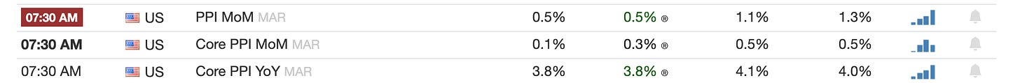 Tomorrow is PPI. It should be a catastrophe. But, I don’t think anyone cares. UPDATE: PPI came in cool. Very unexpected.