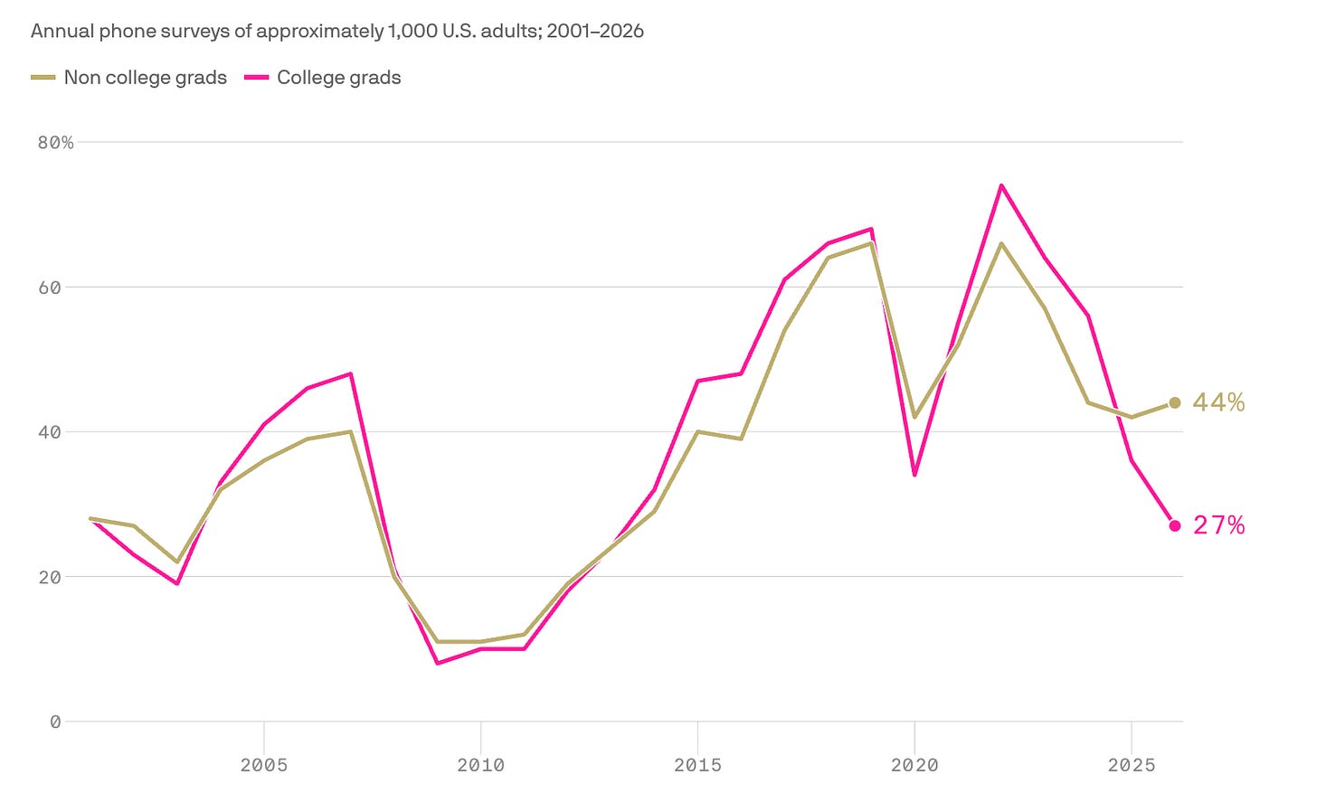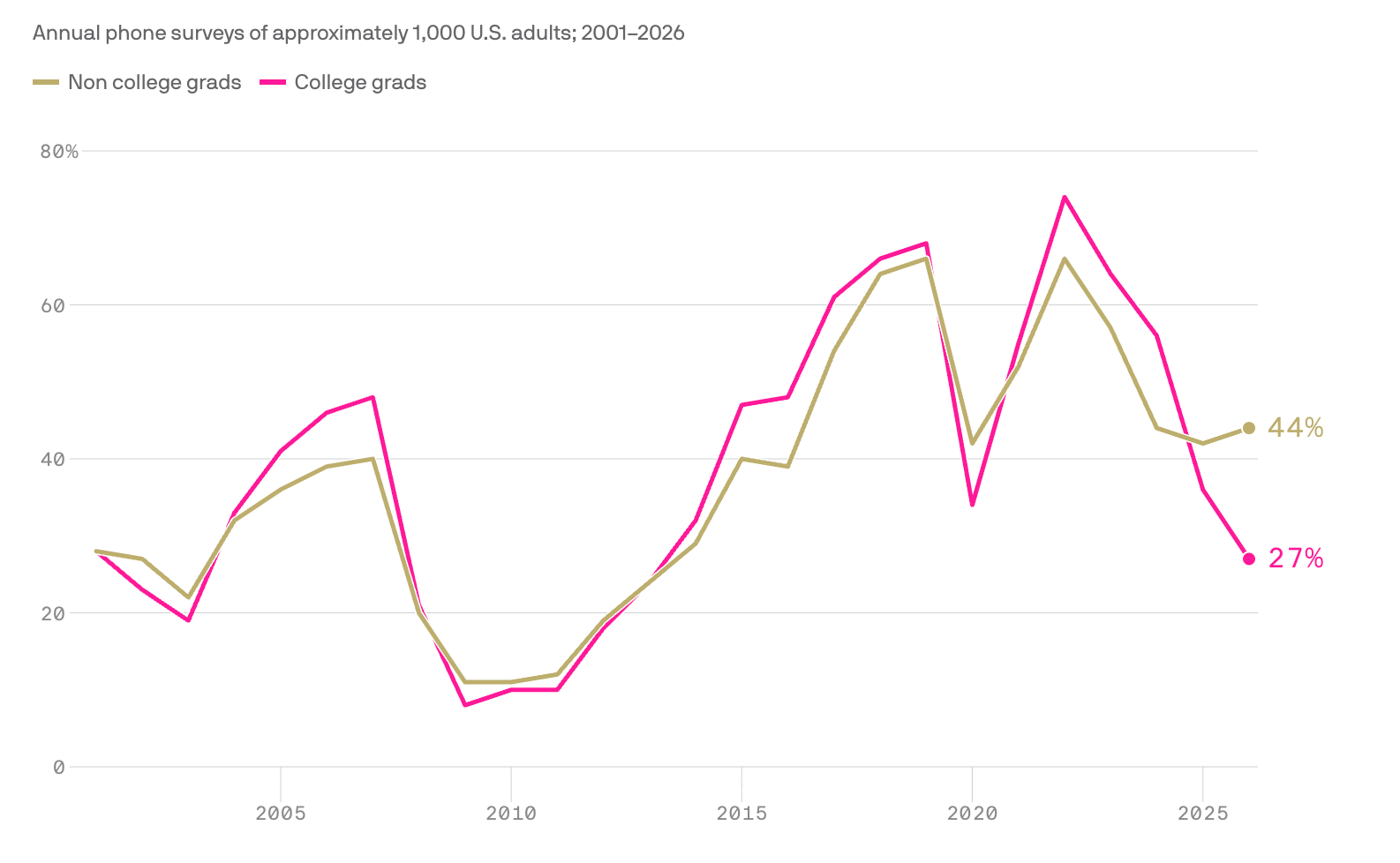 The private credit panic of 2026 is partially just investors tired of constant uncertainty. College educated individuals were already stressed out before the war. The number of respondents who felt comfortable with their job and job market is approaching pre-Obama levels. Remember, the stock market was DOWN for an entire decade the last time people were this pessimistic.